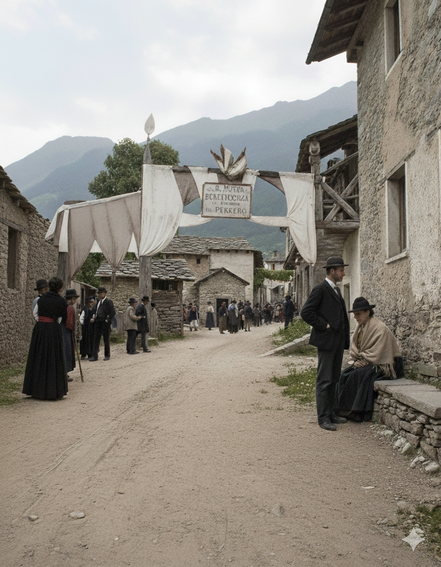 Ricreazione AI dell’ingresso addobbato di Perrero in base all’illustrazione dell’epoca.