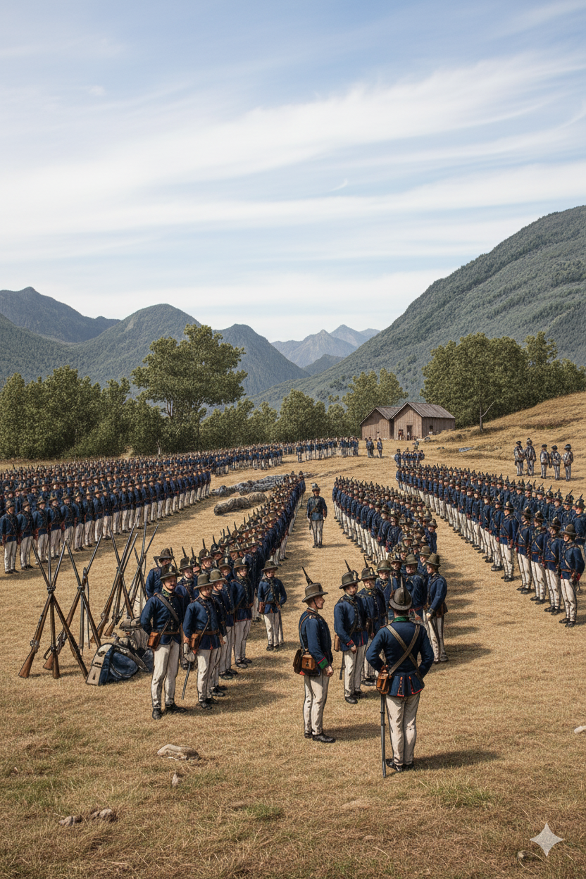 Ricreazione AI della rivista delle truppe in base all’illustrazione dell’epoca.