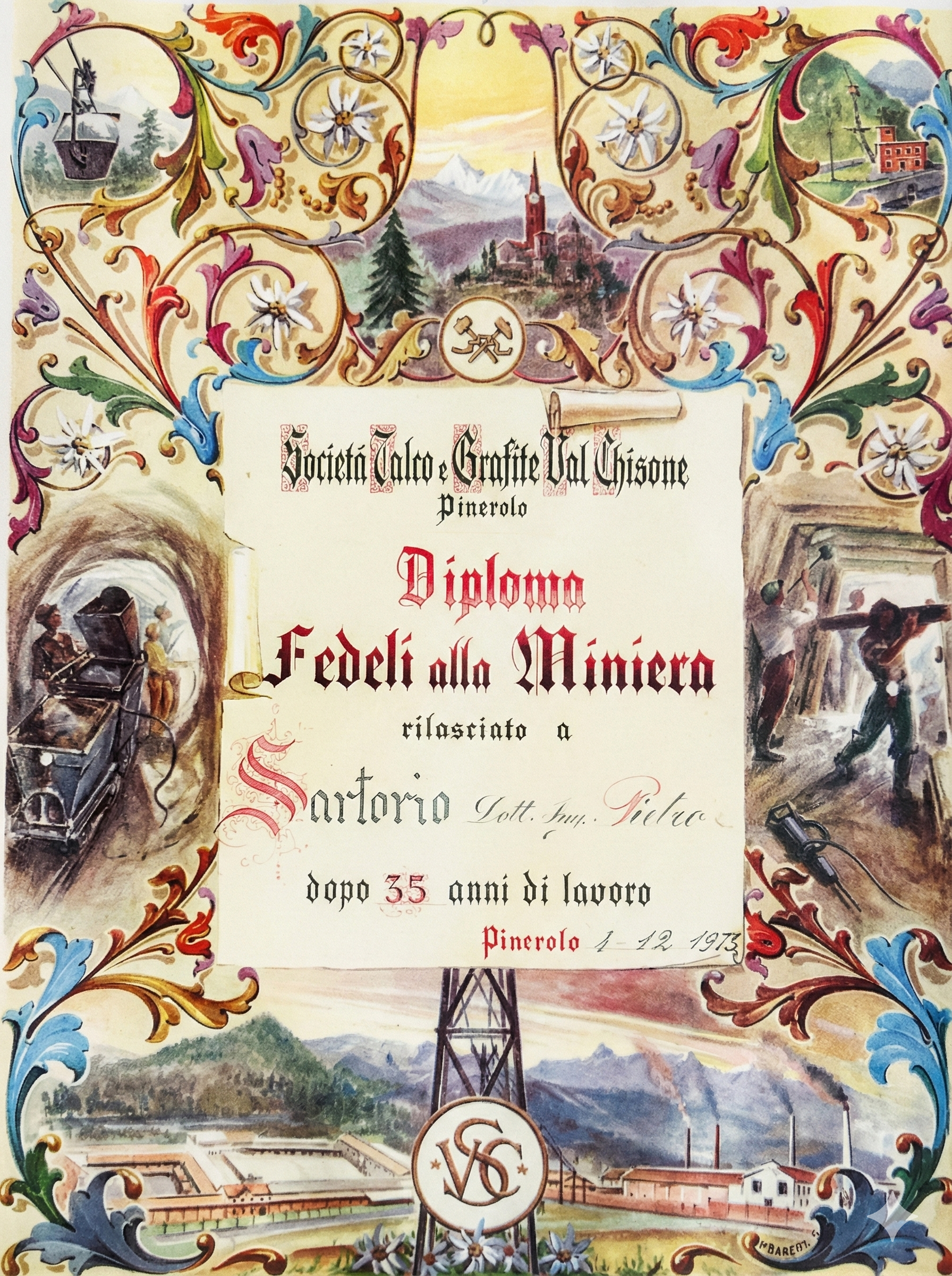 Diploma dei “Fedeli alla Miniera” conferitogli il 4 dicembre 1973
